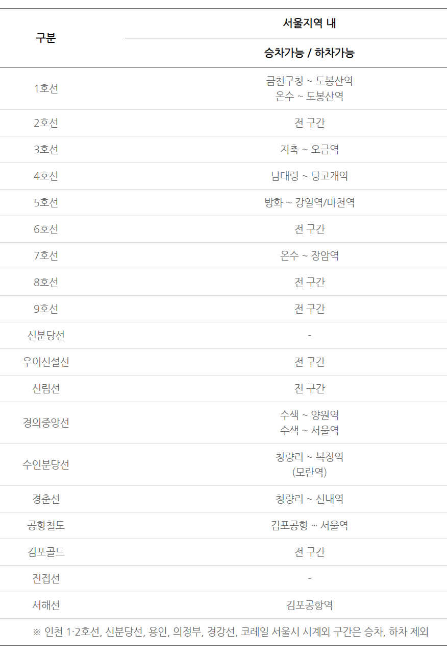 - 지하철의 경우도 이용할 수 없는 구간이 있으니 아래의 이미지를 참고하시기 바랍니다.